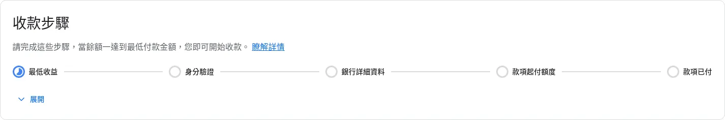 今天打開 Adsense 看到了一個新的卡片——收款步驟。基本上就是將要完成什麼事情才能收款用比較淺顯易懂的方式列在上面。
