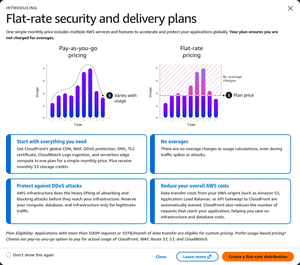 最近 AWS 推出了新的 CloudFront 計費方案。以前使用 CloudFront 都是用多少就付多少錢,這次新方案則是固定價格,分成 Free、Pro、Business、Premium 四種,每種都有各自的用量上限,超過用量不會被多收錢,但服務水準可能下降,也可能會要求你升級到更貴的方案。