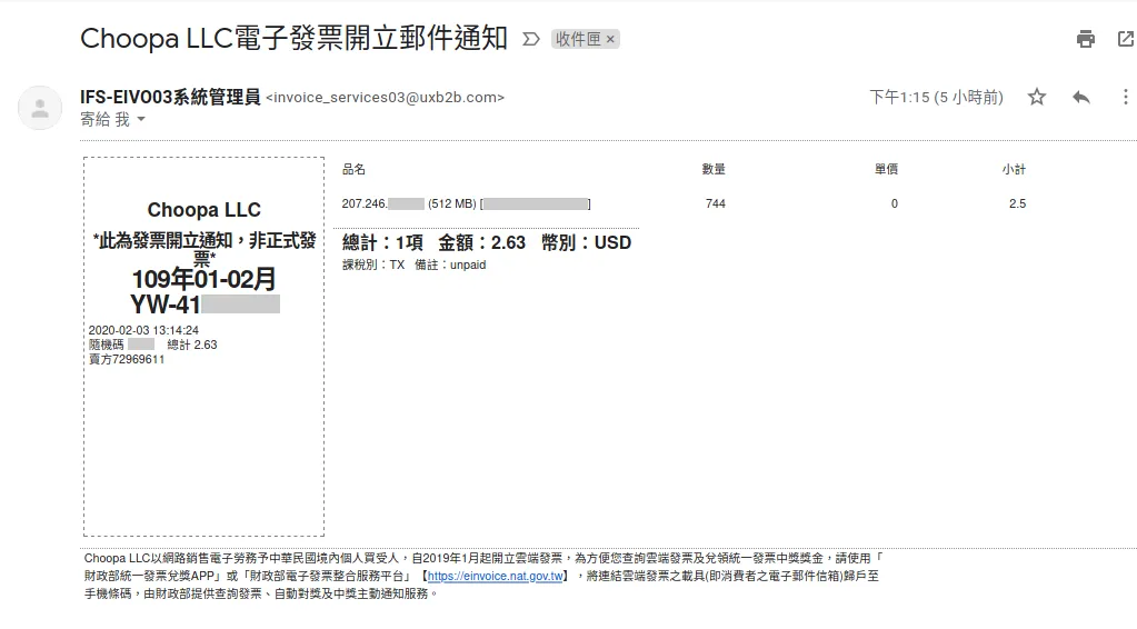Vultr 從 2018 年 7 月開始對台灣的用戶加收營業稅,到上個月為止都沒有開發票。終於在收了一年半的稅後,開始開發票了。
