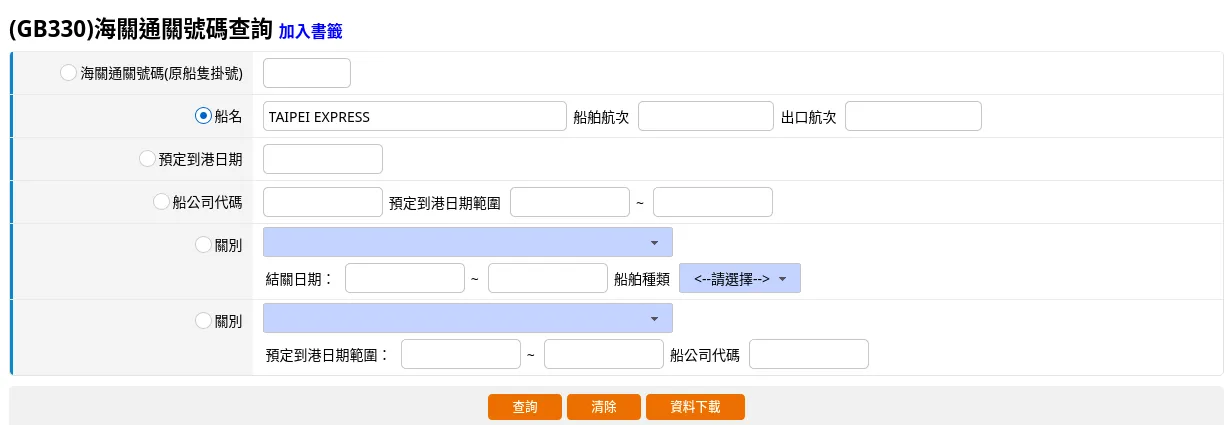 先到免證查詢服務的船機申報資料下的(GB330) 海關通關號碼查詢,輸入剛剛得到的船舶名稱: