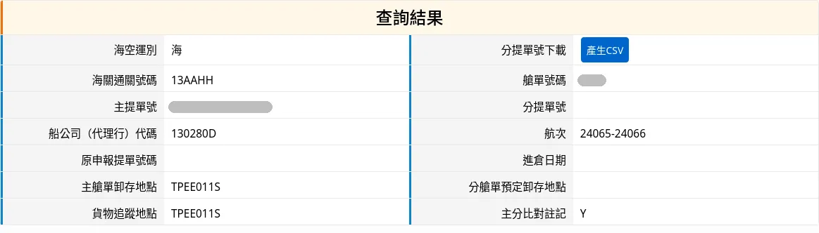 怎麽知道我找到的海關通關號碼是正確的呢?到(GB326) 海運進口艙單資料查詢,在「海運進口艙單資料查詢三」分頁,輸入海關通關號碼與主提單號,正確會有類似下面的結果: